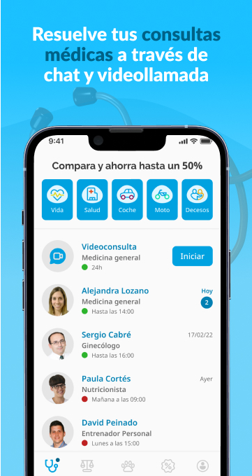 - Realitza consultes mèdiques amb especialistes a través del xat les 24 hores.